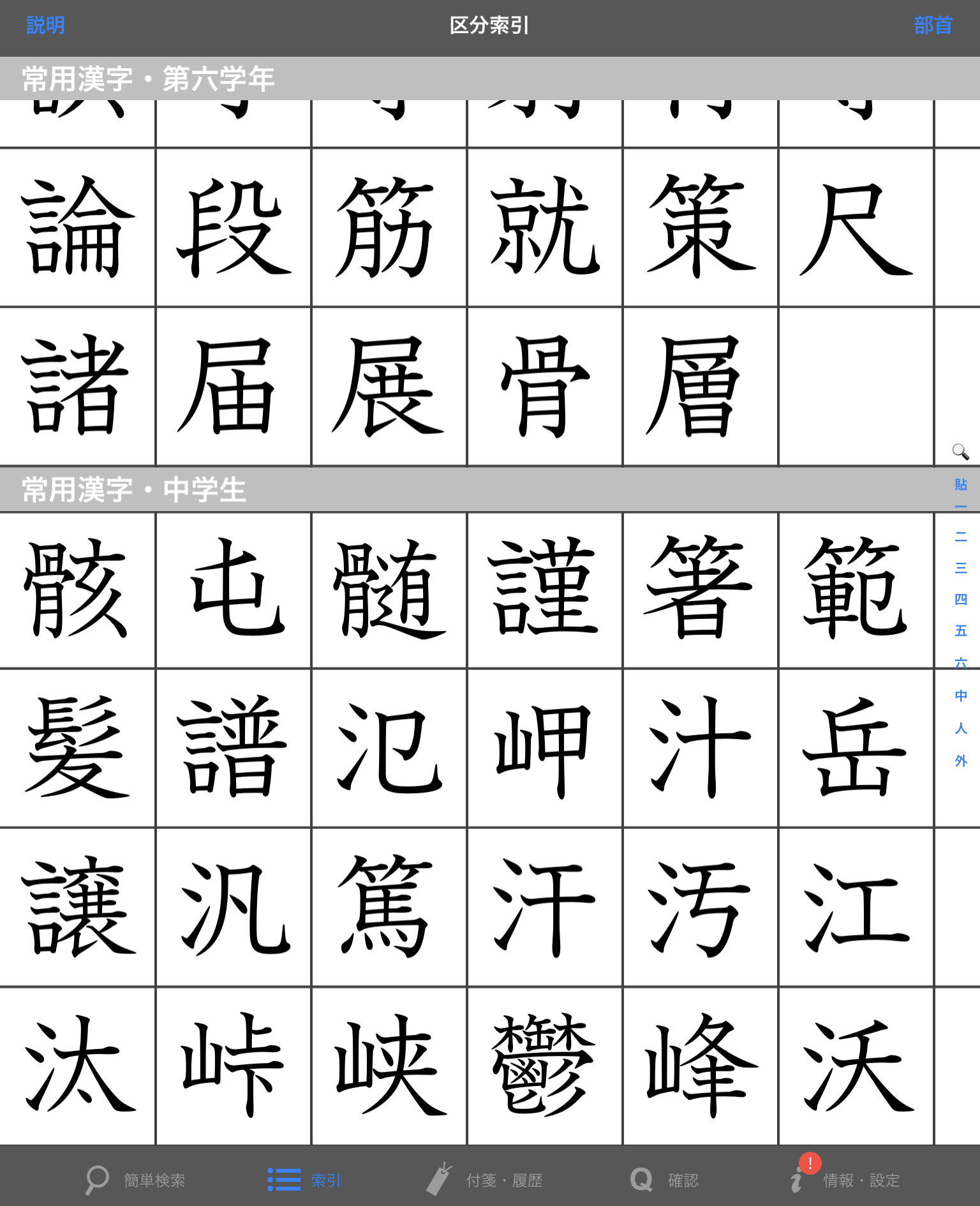 漢字検索では手書き、画数検索、部首検索などができます。以下の画像は学習学年別検索です。