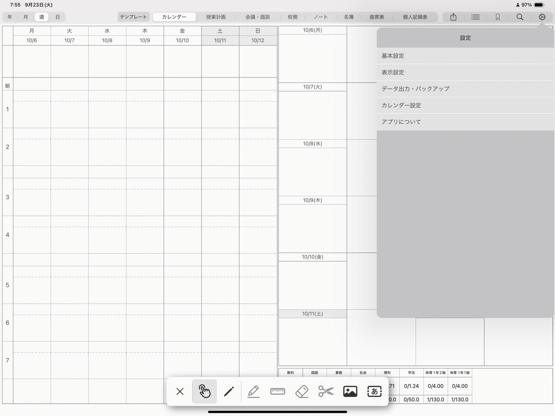 設定メニューから「データ出力・バックアップ」を選択していただき、「授業数出力」をタップし、出力したい期間にチェックを入れてください。