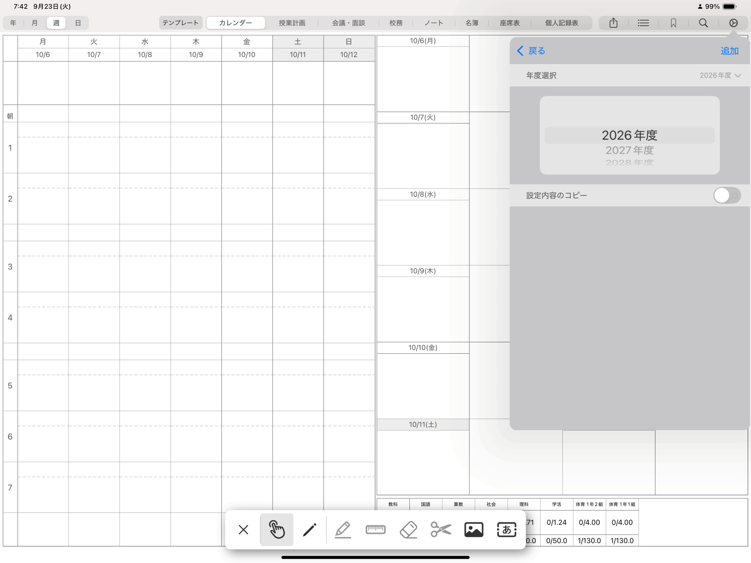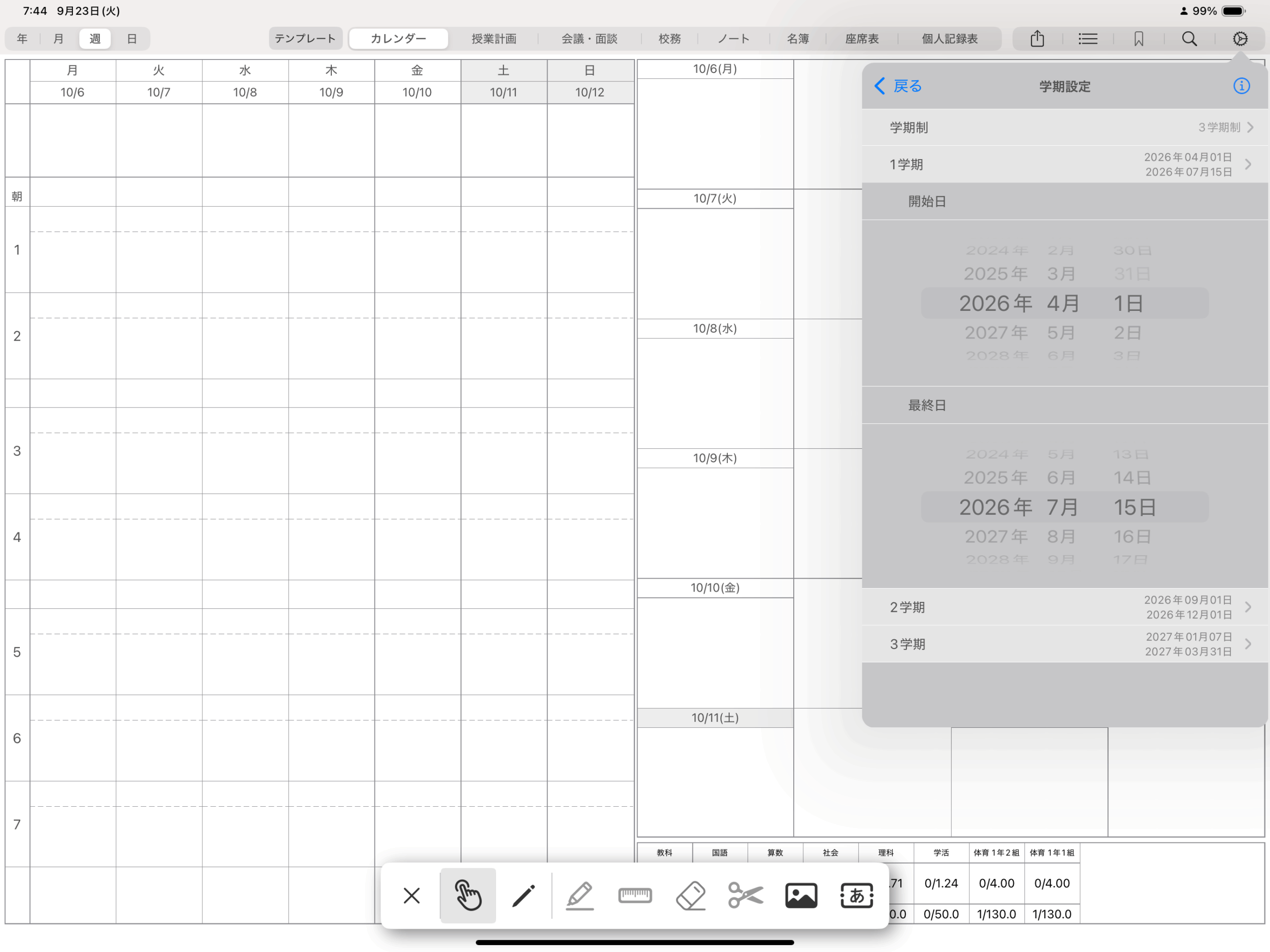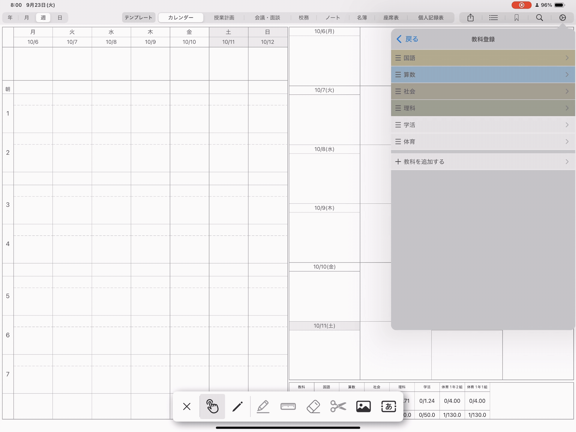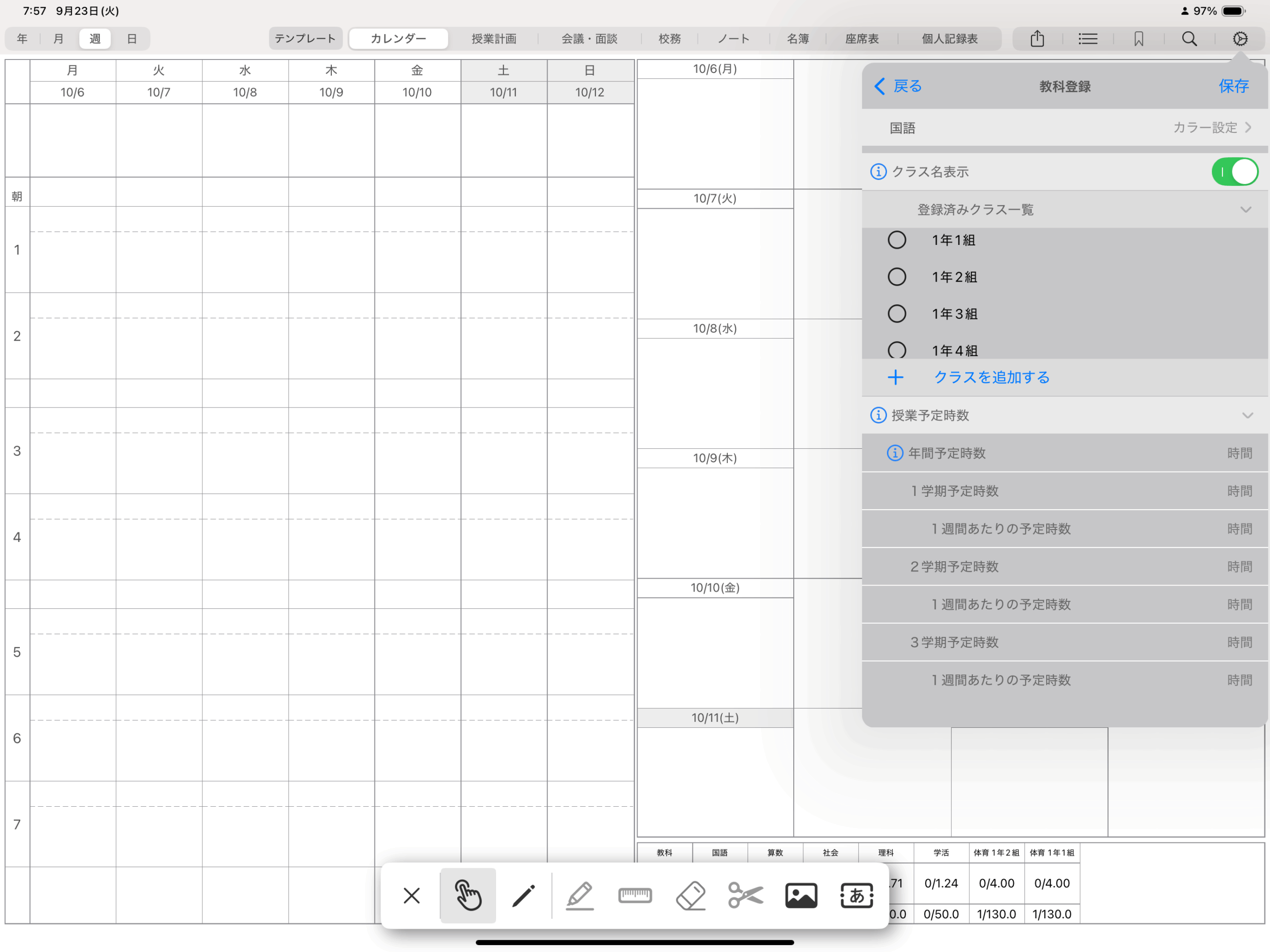 また、時間割に教科や朝行事を登録する枠、カレンダーやリマインダーを表示する枠(ページ右半分の日付下の枠)、時数集計表には書き込みができません。(画像/テキストの配置は可能)