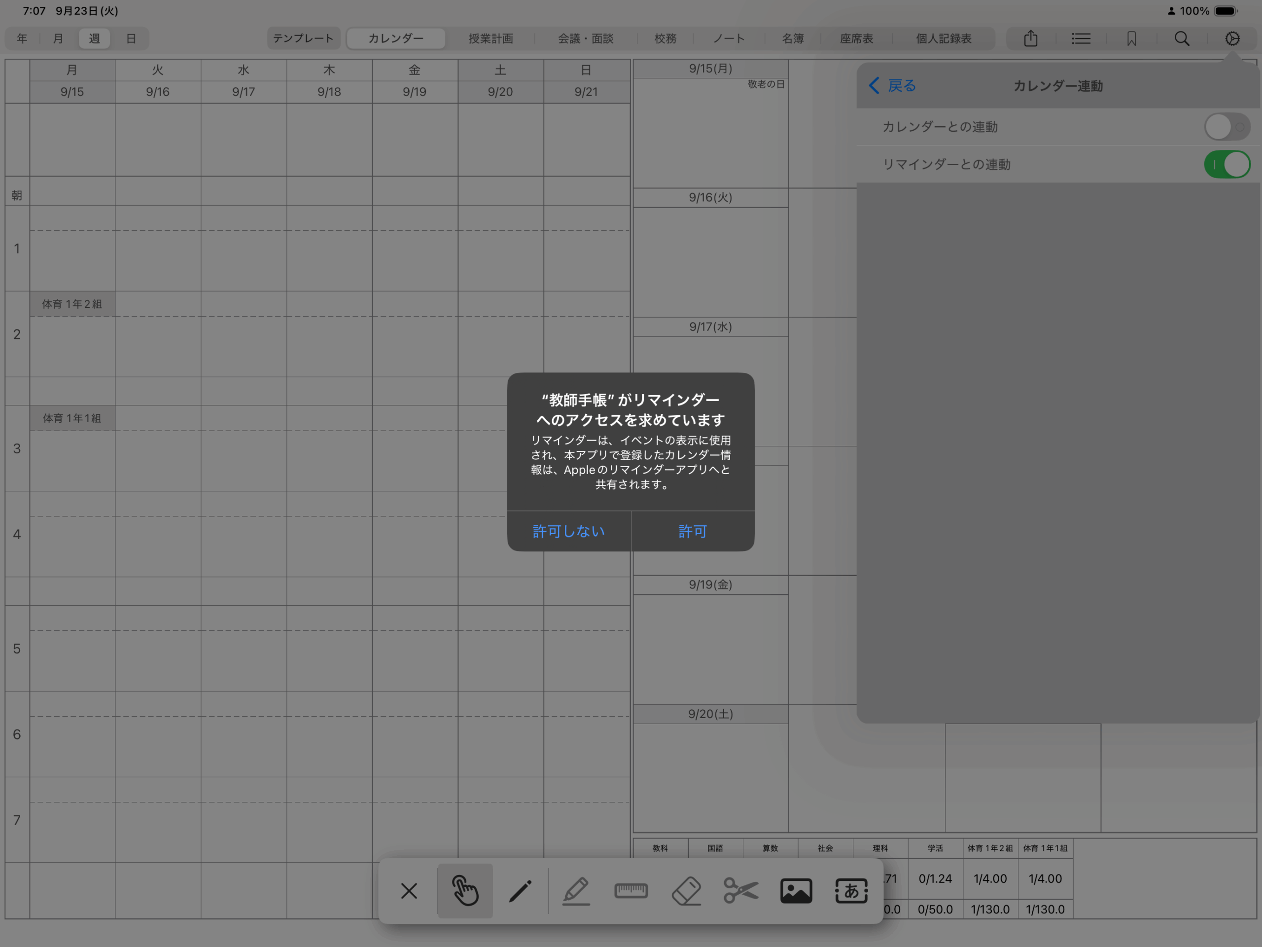 「カレンダー連動」を選択し、「カレンダーとの連動」「リマインダーとの連動」をオンにすると、アクセスの許可を求めるポップアップが表示されますので、「許可」を選択してください。