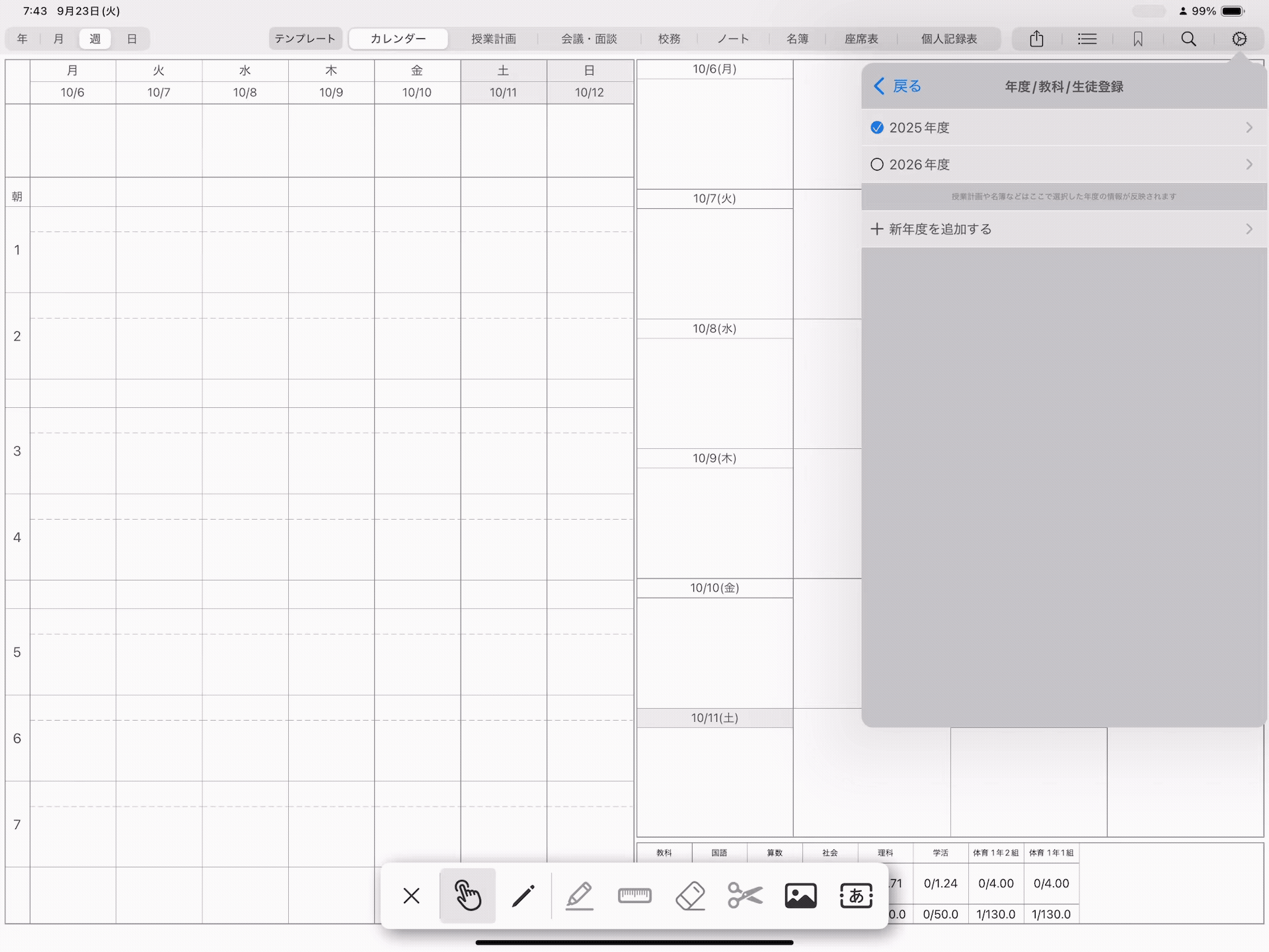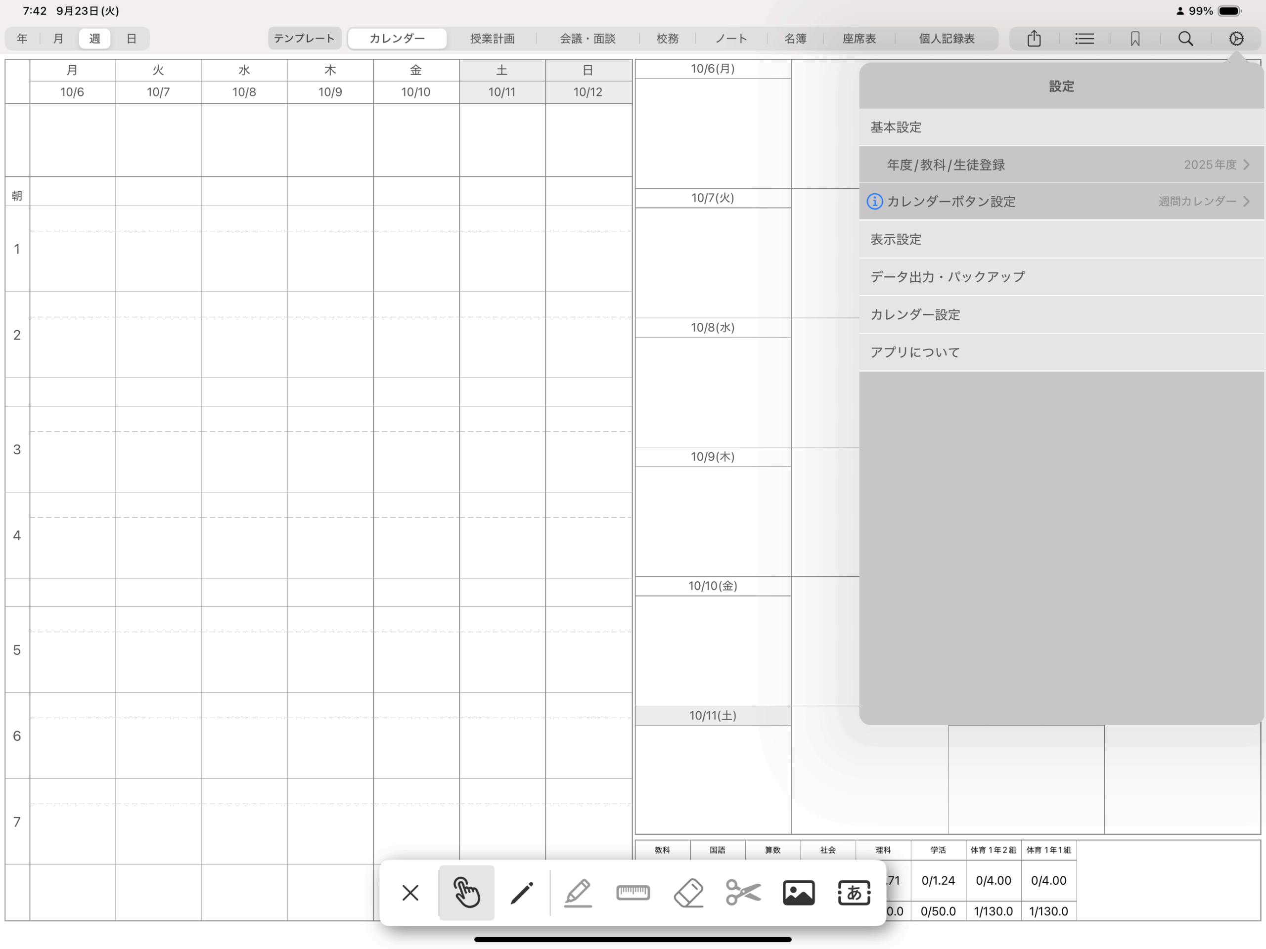 リスト形式の年間カレンダーについても、描画エリアとボタンが重なっているため、ボタンを操作するにはペンシルメニューを操作モードに変更いただく必要がございます。