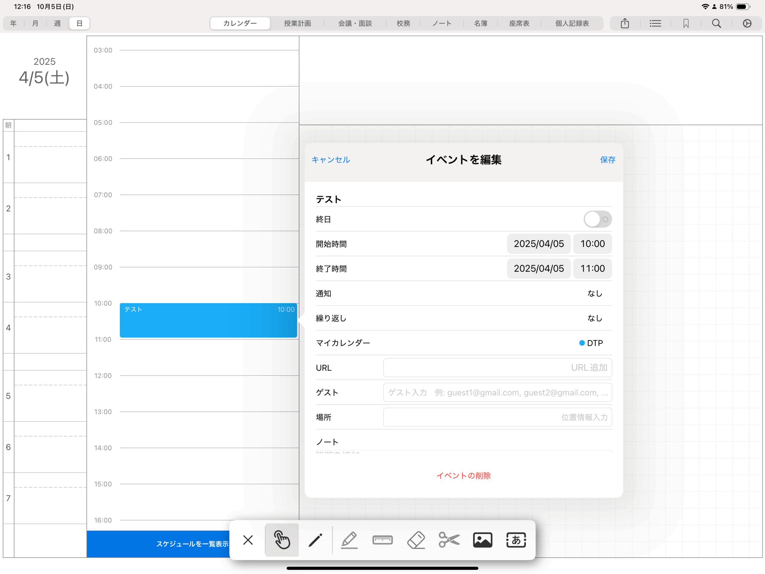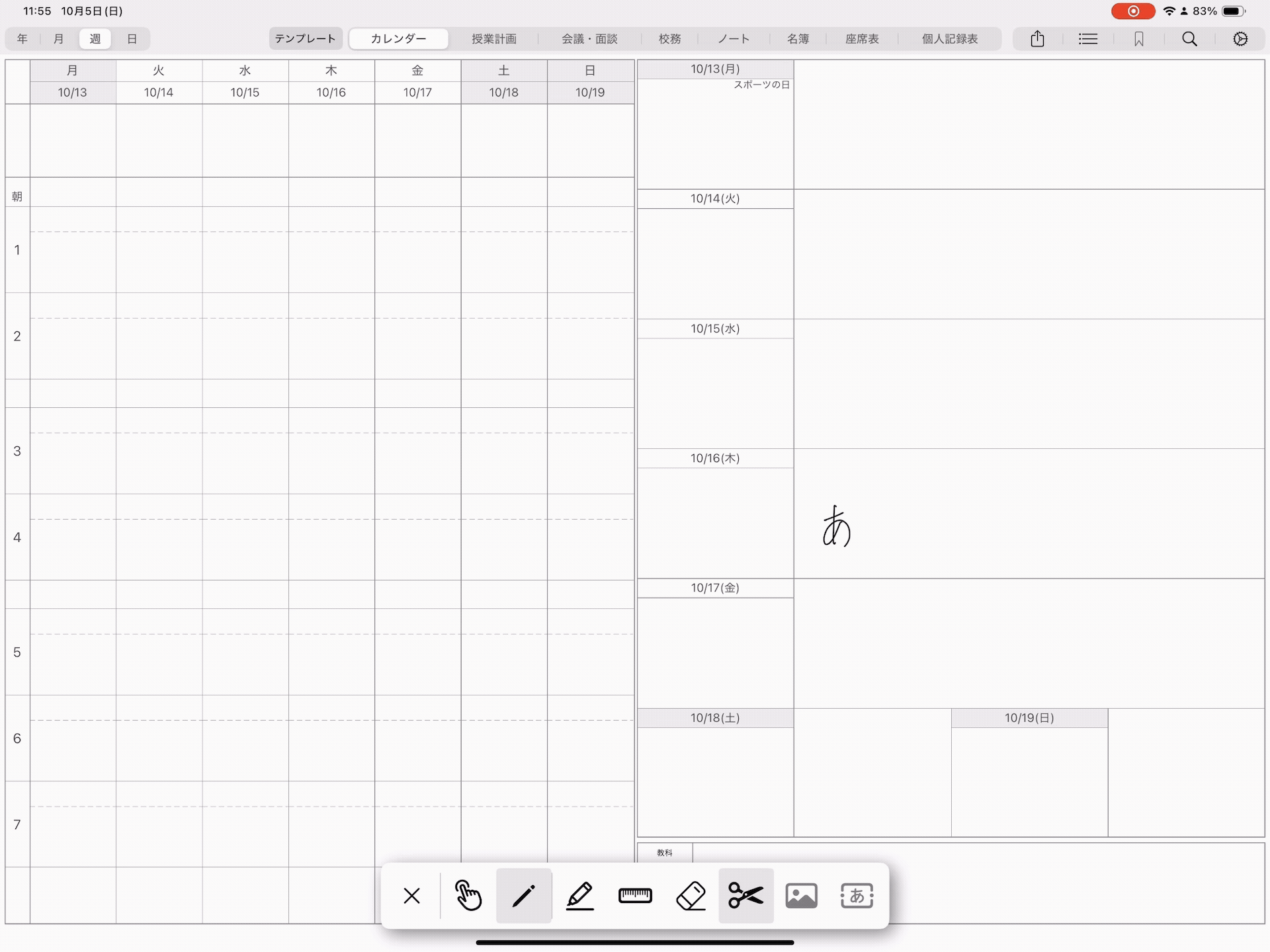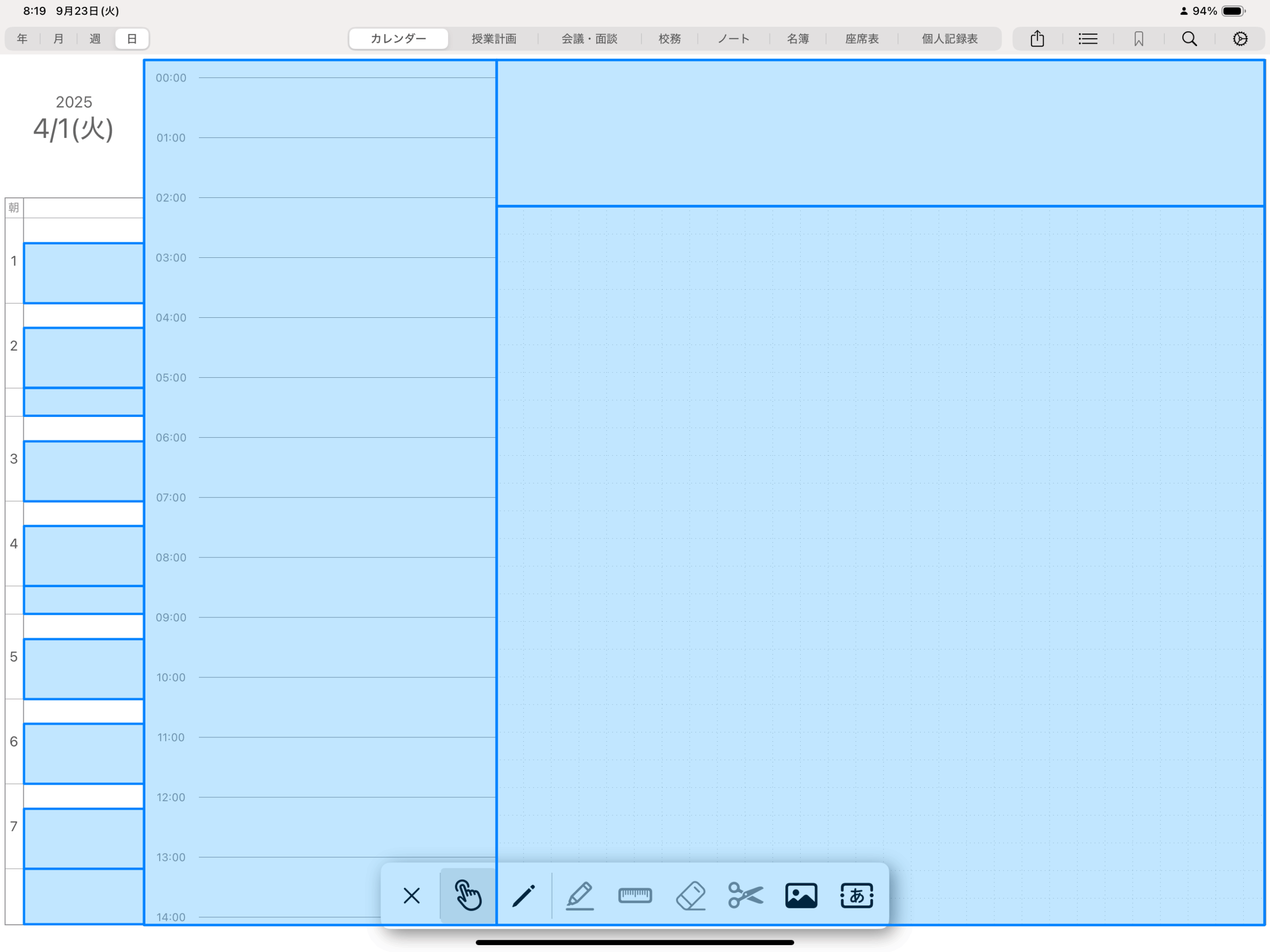 年間カレンダーや月間カレンダーの一部など、手書き入力中は操作できない部分は、ペンシルメニューで操作モードに切り替えてから操作していただく必要がございます。