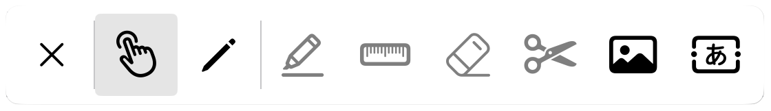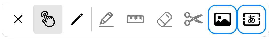 画像やテキストボックスを挿入したい場合は、操作モードに切り替えていただき、ペンシルメニュー右端にある画像のイラストか、テキストのイラストをタップすることで挿入可能です。