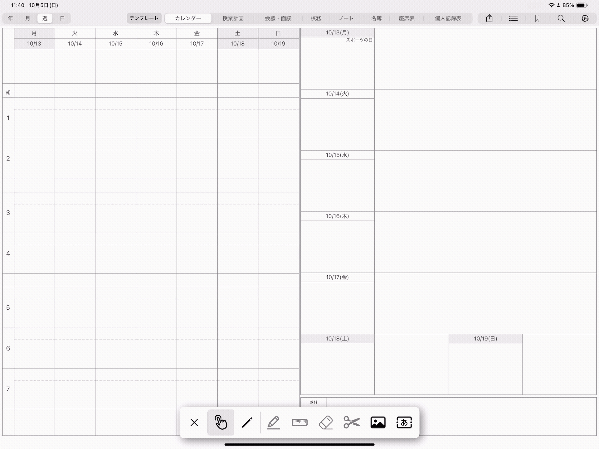 また、時間割に教科や朝行事を登録する枠、カレンダーやリマインダーを表示する枠(ページ右半分の日付下の枠)、時数集計表には書き込みができません。(画像/テキストの配置は可能)