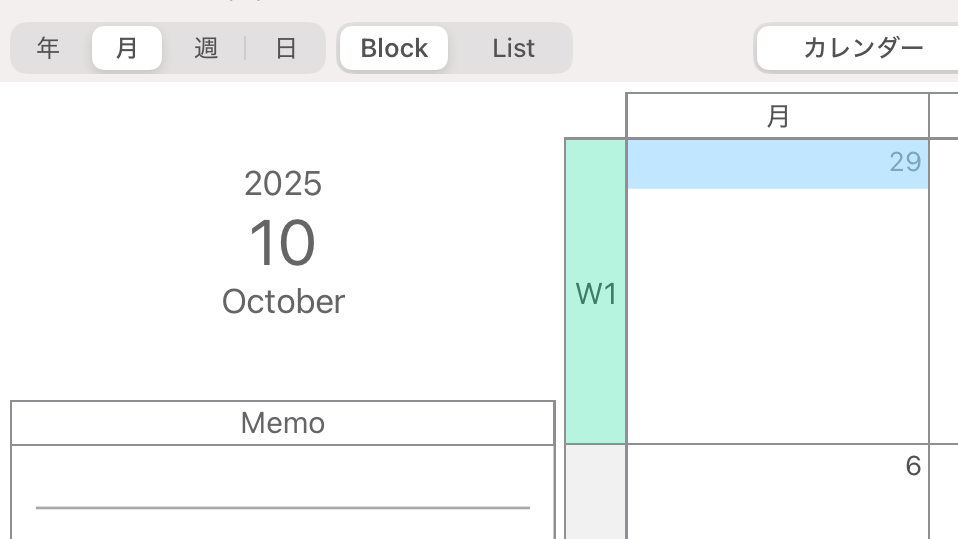 月間カレンダーのブロック表示では以下の位置にボタンが設置されており、W1〜W6をタップすると該当の週間カレンダーへ、日付をタップすると該当の日間カレンダーへ遷移します。