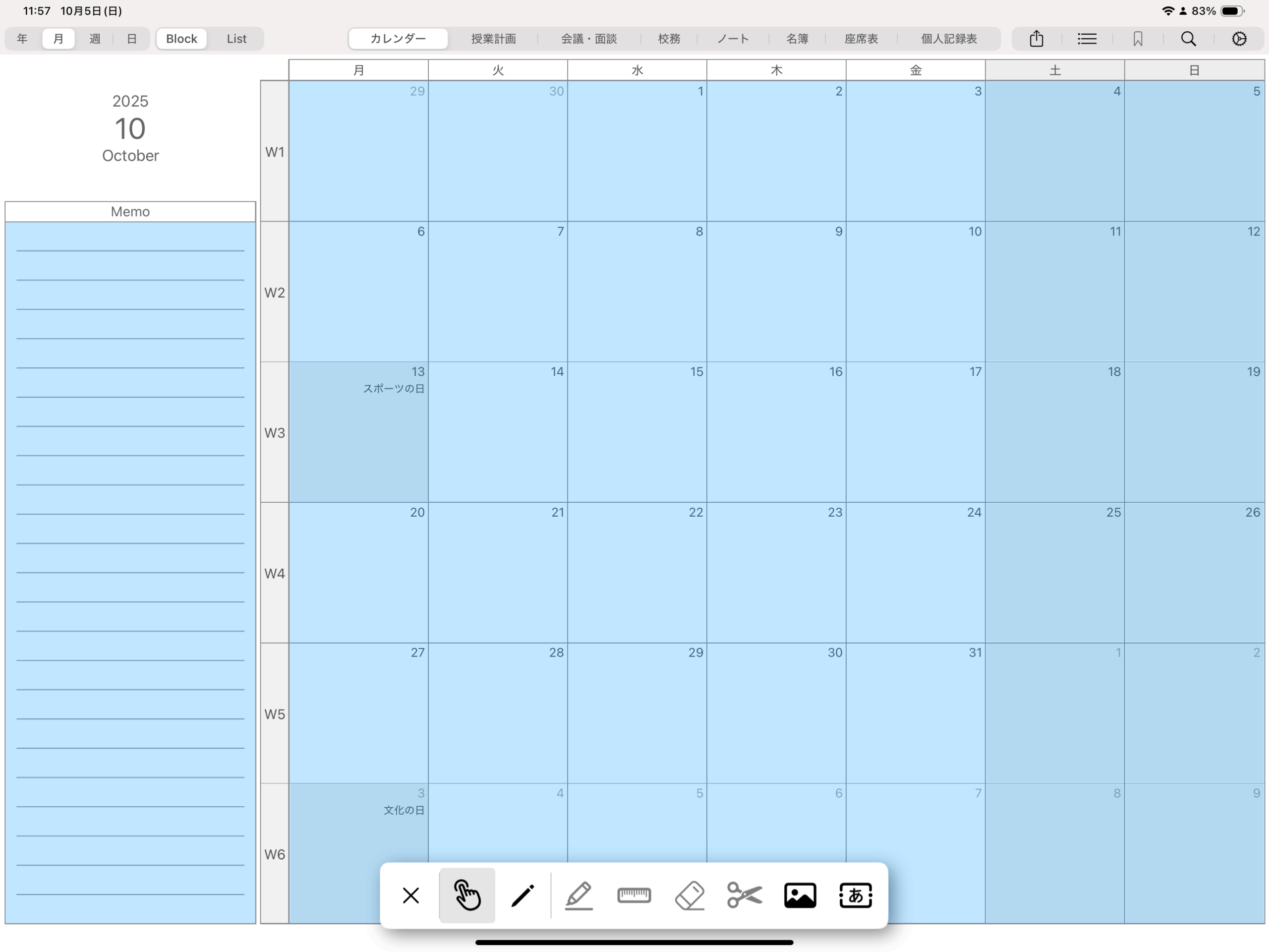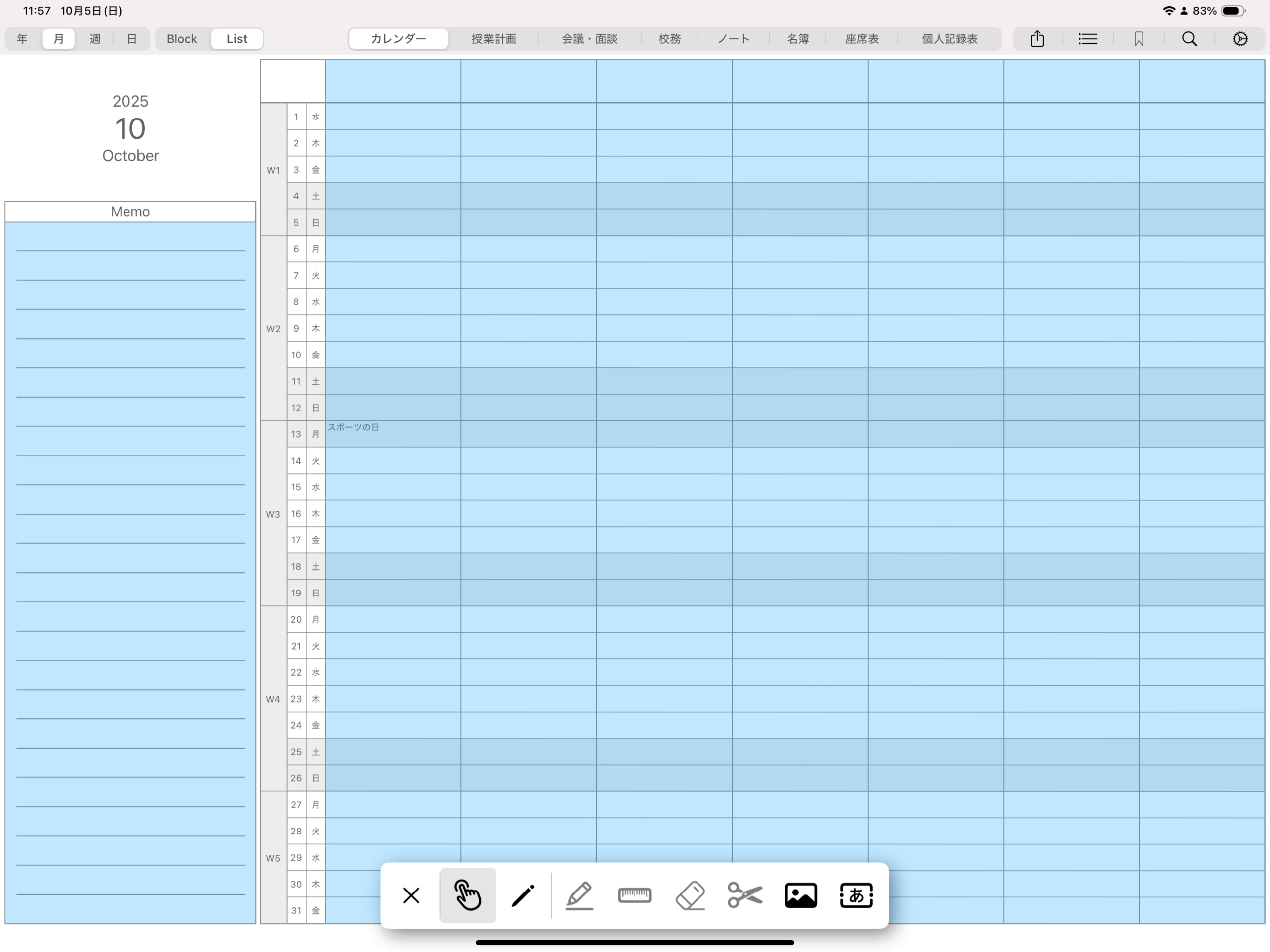 ブロック表示の月間カレンダーの日付ボタンについては、描画エリアとボタンが重なっているため、ボタンを操作するにはペンシルメニューを操作モードに変更いただく必要がございます。