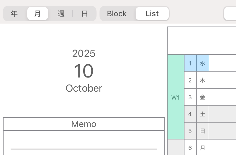 月間カレンダーのリスト表示では以下の位置にボタンが設置されており、W1〜W6をタップすると該当の週間カレンダーへ、日付をタップすると該当の日間カレンダーへ遷移します。