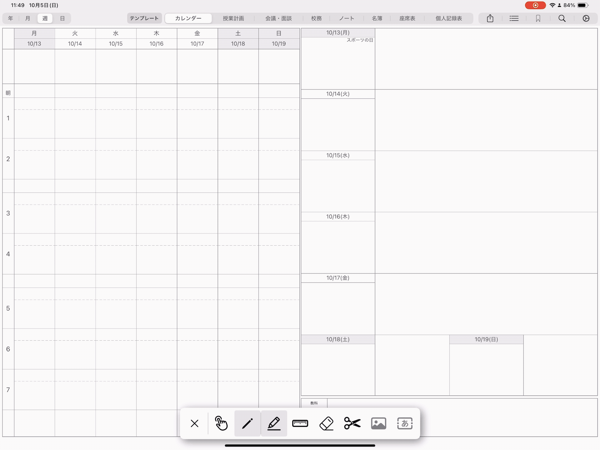 週間カレンダーは、日間カレンダーと手書き内容を同期するため、手書き可能な箇所が細かく分かれております。