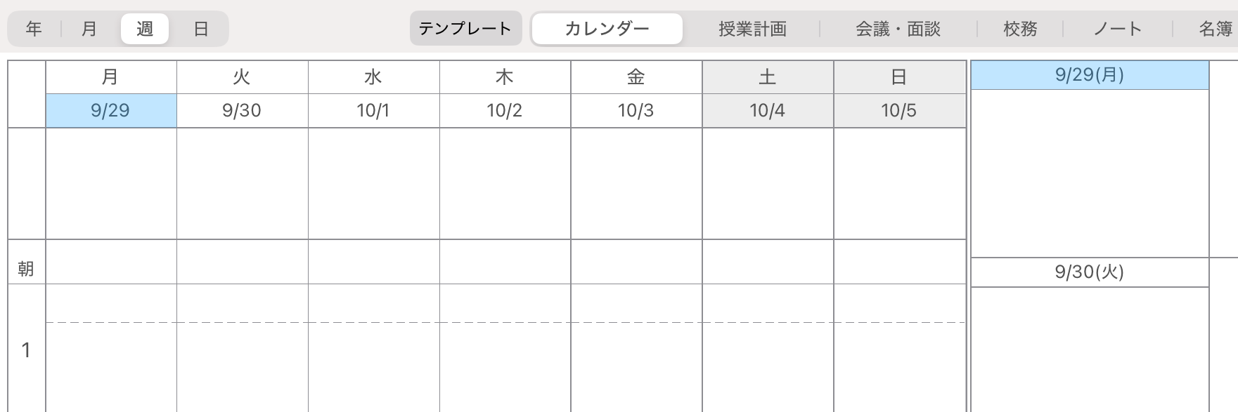 登録された朝行事は、1時間目の上の枠でのみ選択可能です。