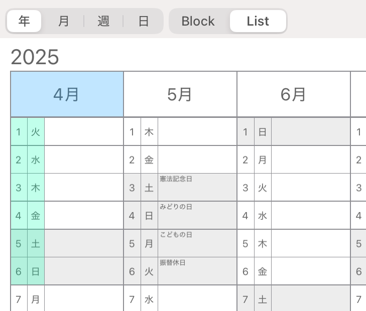 年間カレンダーはブロック、リストどちらも画面全体への書き込みが可能となっております。